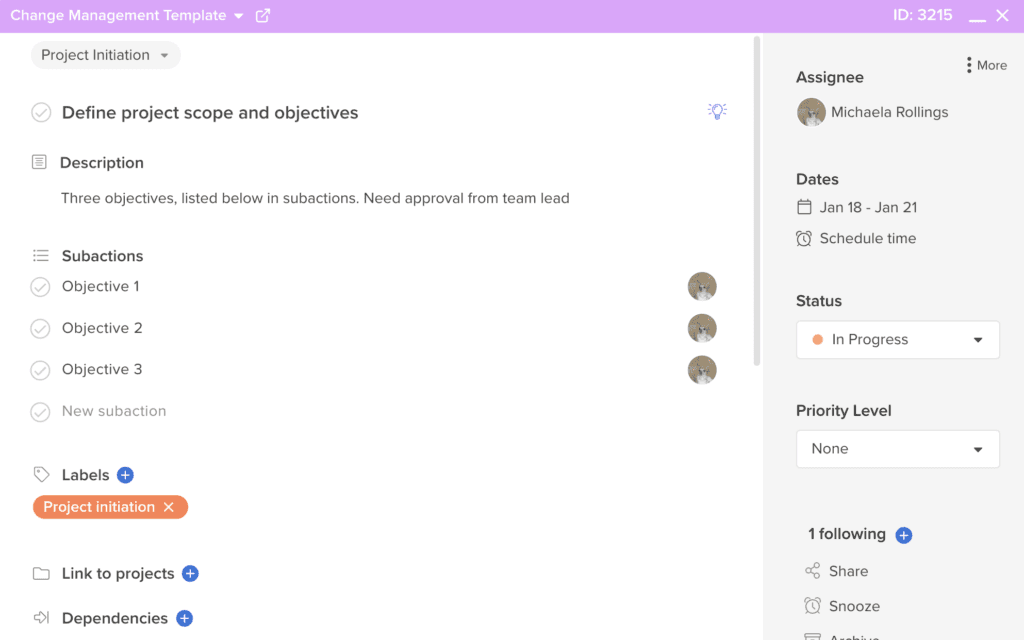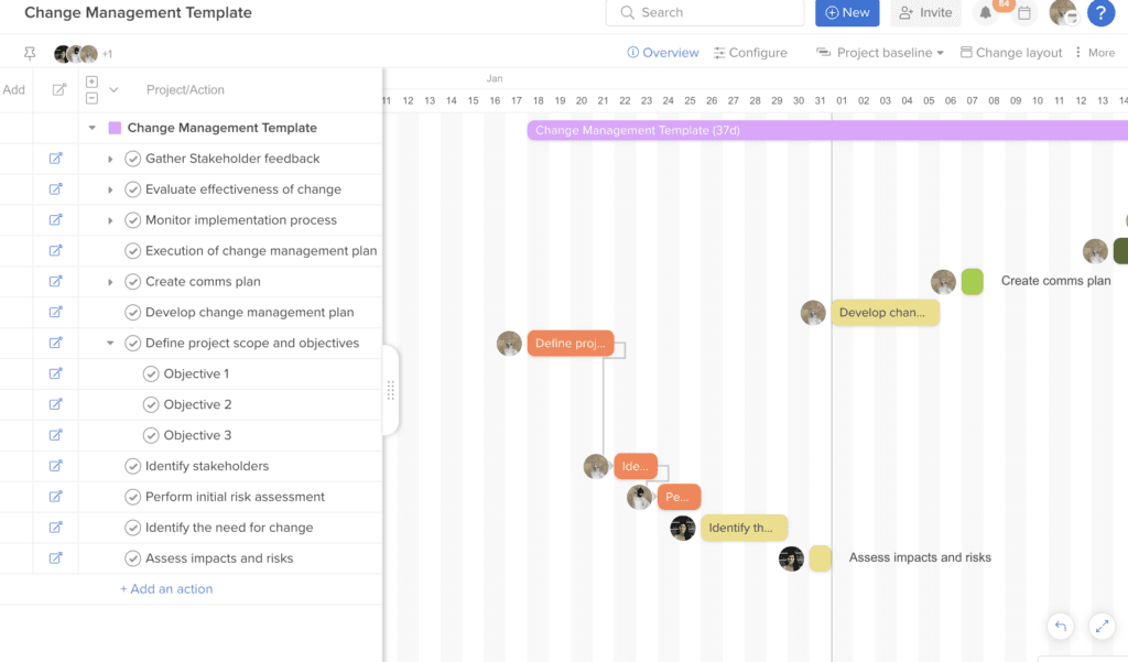 Once you kick off a project from this change management plan template, you’ll be able to edit all of the tasks, subtasks, due dates, and assignees to fit your specific workflow. If it’s easier, you can just use the template as inspiration or a starting point, and create a separate project based on the part of the template that works for you.