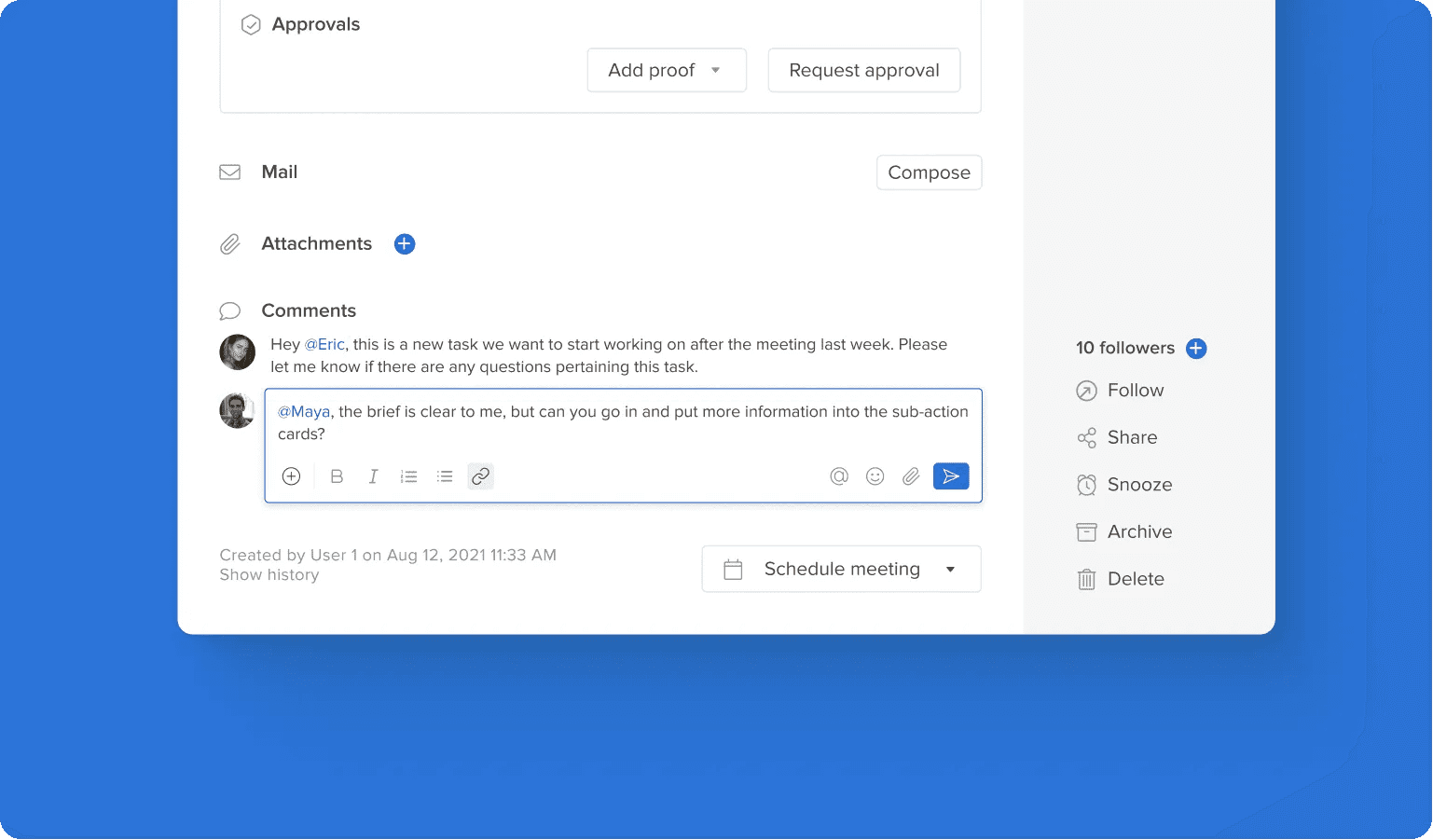 Other ways that Hive enables seamless asynchronous communication is through functions like Proofing & Approvals, Dependencies, Custom Project and Action Card Templates. As Implementers start working on several projects, the amount of comments and emails back and forth can be overwhelming. Using features like Proofing & Approvals and Dependencies helps to dramatically reduce the unnecessary inbox clutter and notifications.