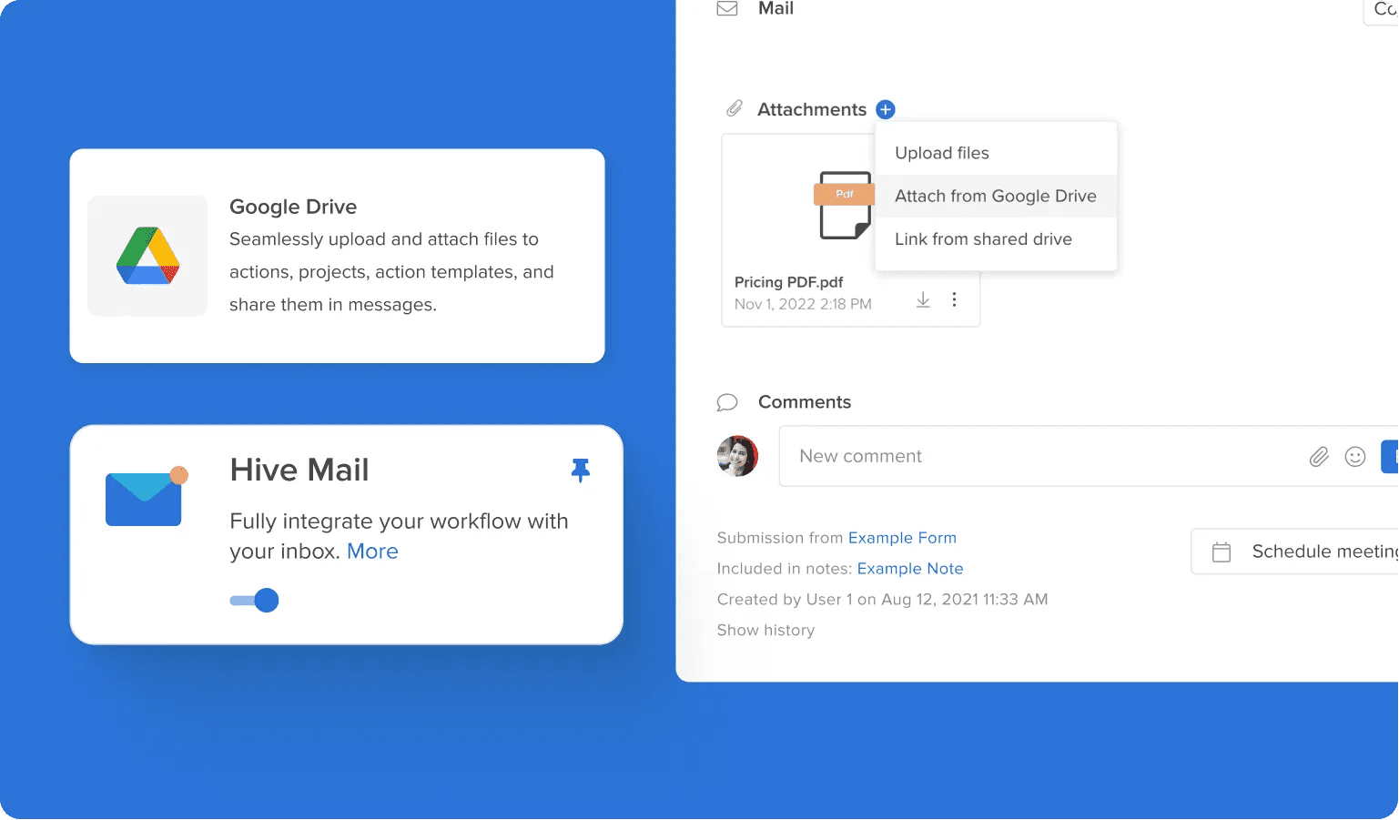 With the Hive and Google Drive integration, they can access the documents they need right from Hive and easily attach them to a project or Action Card. Additionally, Hive Mail lets them communicate with external parties without leaving Hive, which helps cut down on time spent switching between tools. They also love that teammates can attach emails to Action Cards, which helps provide additional context to each task. Overall, Hive has helped LVL-Up to deliver work in a more timely and efficient way for their clients, which has helped their business grow and evolve at a fast pace.