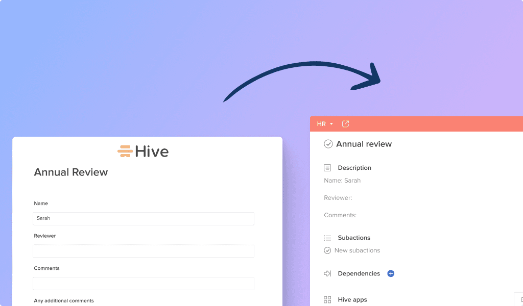 The PMO uses customized Hive Forms to gather information from people internally or externally for a variety of use cases, including project intake, annual reviews and audit requirements. Fazio and the team have set up custom forms to automatically create action cards in Hive with all the form details automatically populated, reducing the need for manual input.