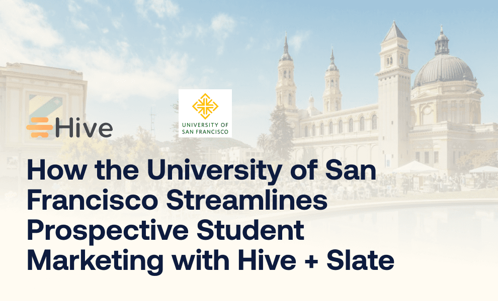 USF’s use of Hive shows how higher-ed teams can bridge the gap between strategic enrollment planning and day-to-day execution. By pairing Hive with Slate, they’ve built a marketing engine that is agile, audience-aware, and built to scale.