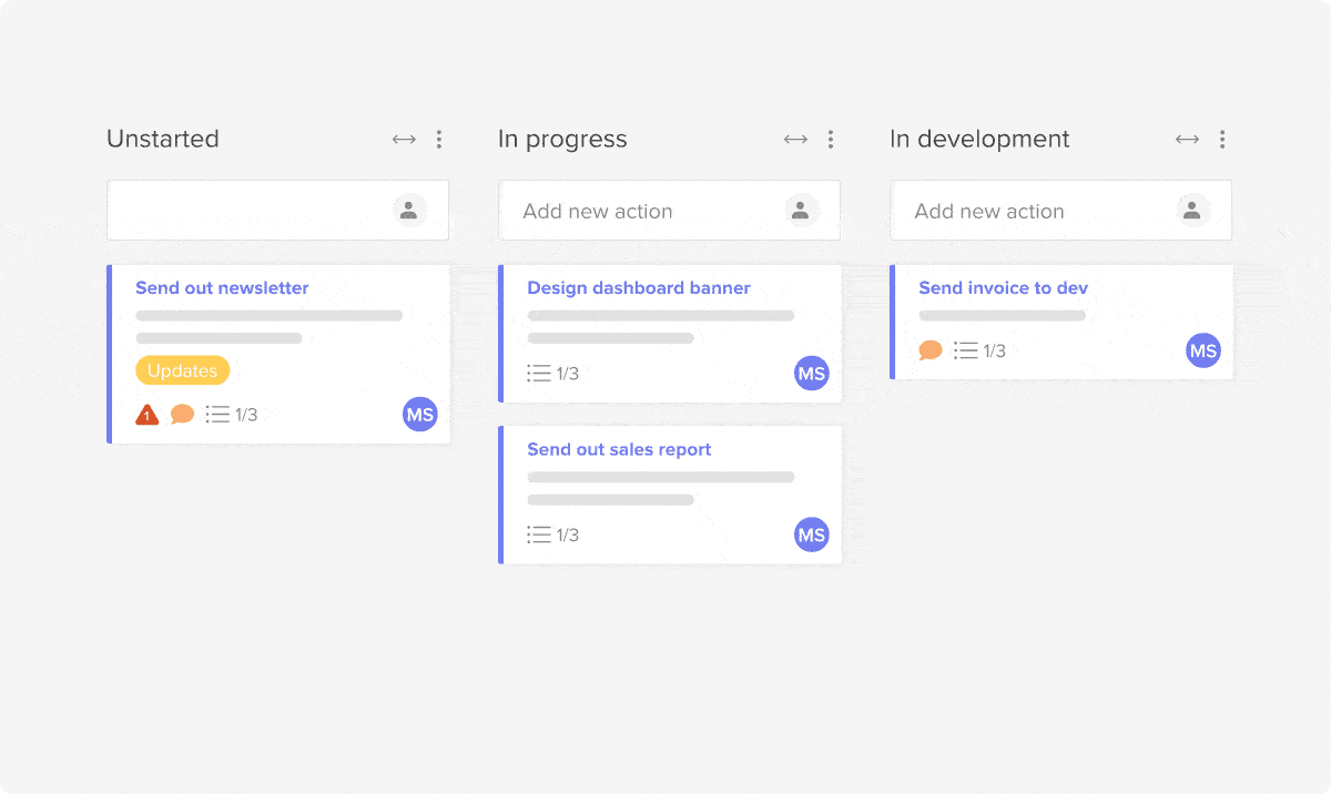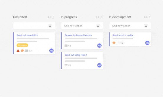 To add a new task, just put your task name into the “Create new action” prompt at the top of each status bucket.