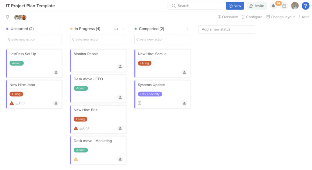 We’ve laid out each task as an individual action card in this IT project plan template, which is ideal for tracking tech-heavy items, as there is often substantial back-and-forth about the task. It’s easy to slide the tasks along the Kanban view board, which will change the status of them will automatically – which is why we chose it as the default status for this template