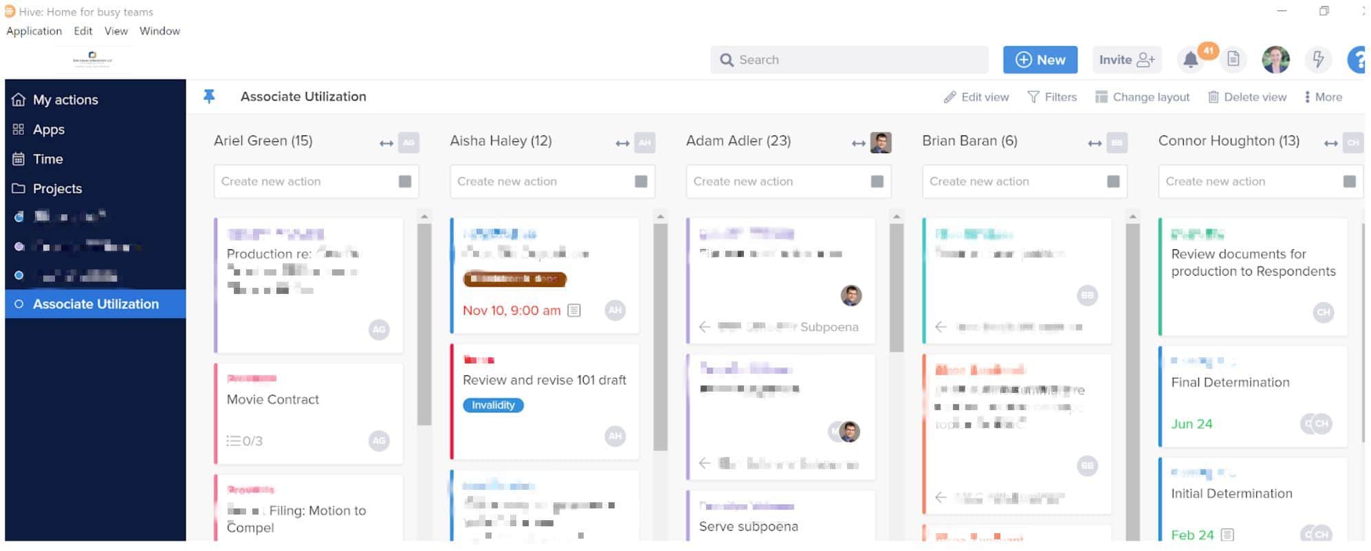 From there, a team is assigned to the case. The best part? The senior leadership team can easily find the right associate with Hive’s summary view — they can see exactly who is working on what, and who has the bandwidth to take on this new case.