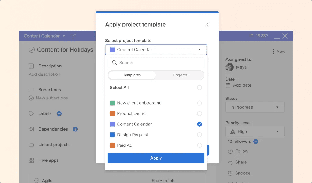 Lindsey highlights that using Hive templates means the team can be sure they are covering everything that needs to be covered. Applying a template to a new or existing work project makes it easy to add specific actions, dates and assignees automatically, so nothing gets left out.