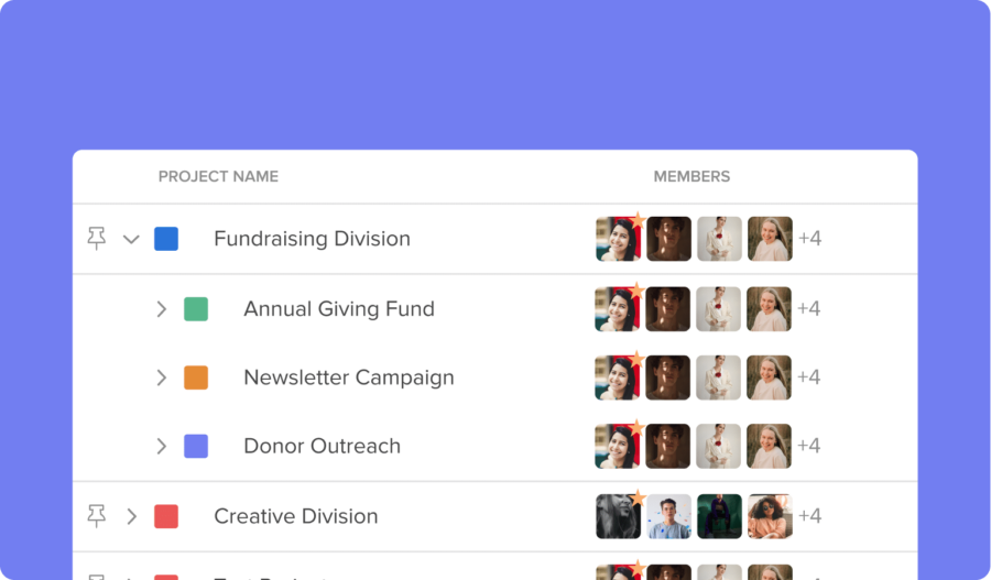 - The marketing-communications team creates Parent projects for each client. Remember these clients = different divisions of the organization that they create work for, such as the Fundraising division.