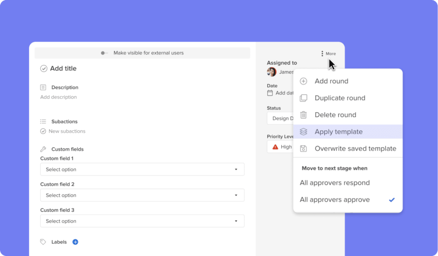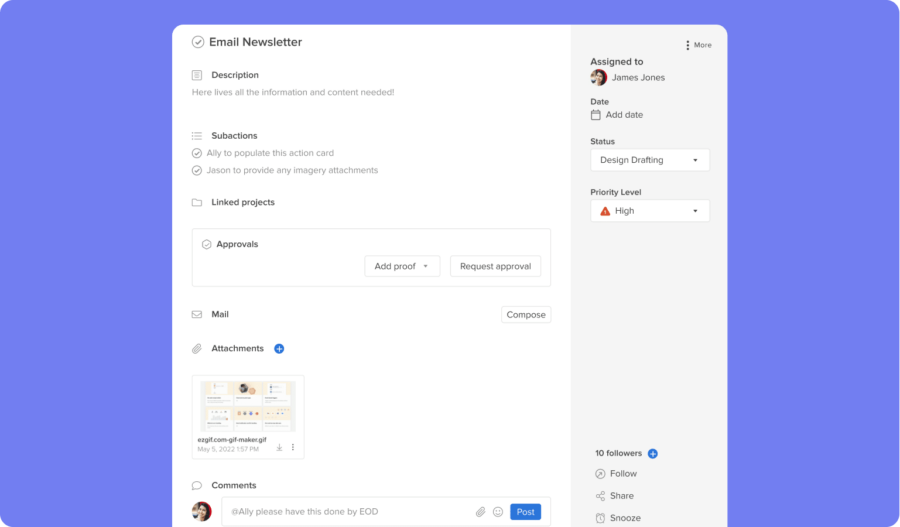The team can create one action card to serve as the ‘single source of truth’ for campaign information within the emergency project. This includes essential information and documents, such as updated assets, press releases and approved terminology, so that everything is aggregated in one place and updated in real-time. Working in this way removes the need for people to sift through emails or chat threads for the latest version of a document.