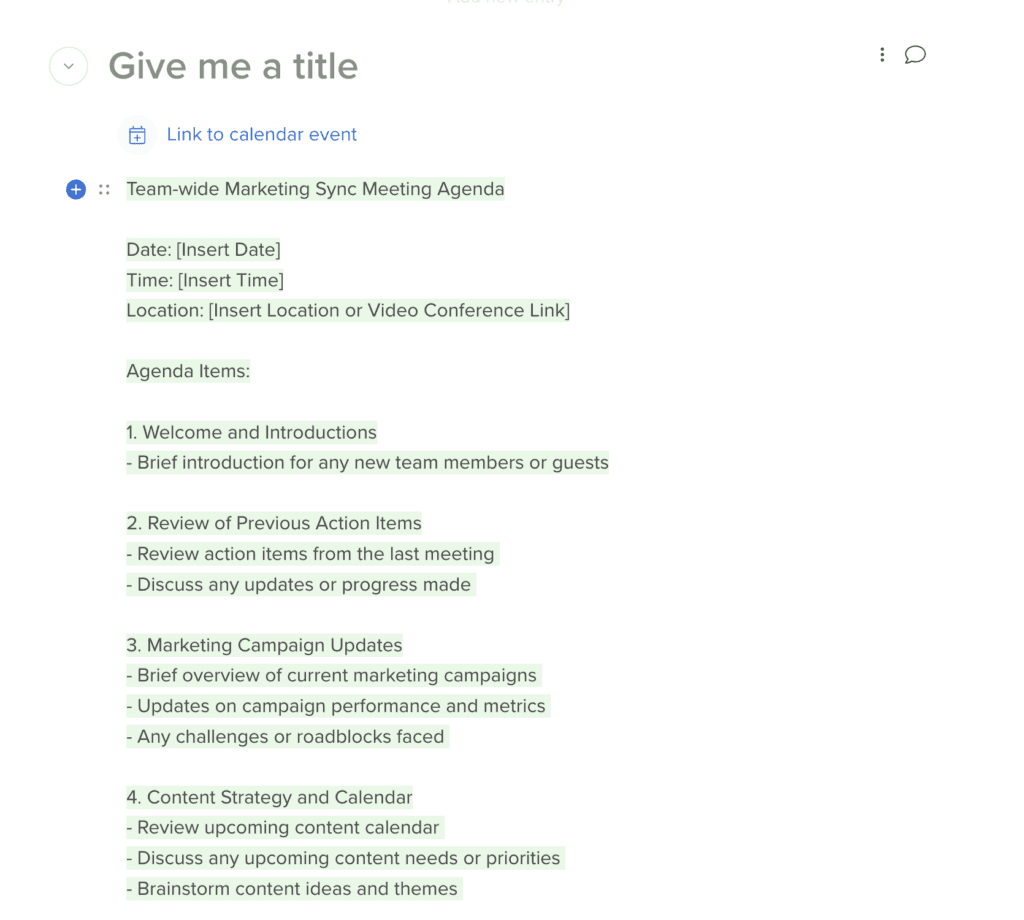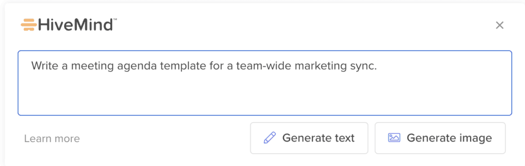From there, you can just ask Hive Mind to write the perfect meeting agenda template based on the items you drop into the prompt.