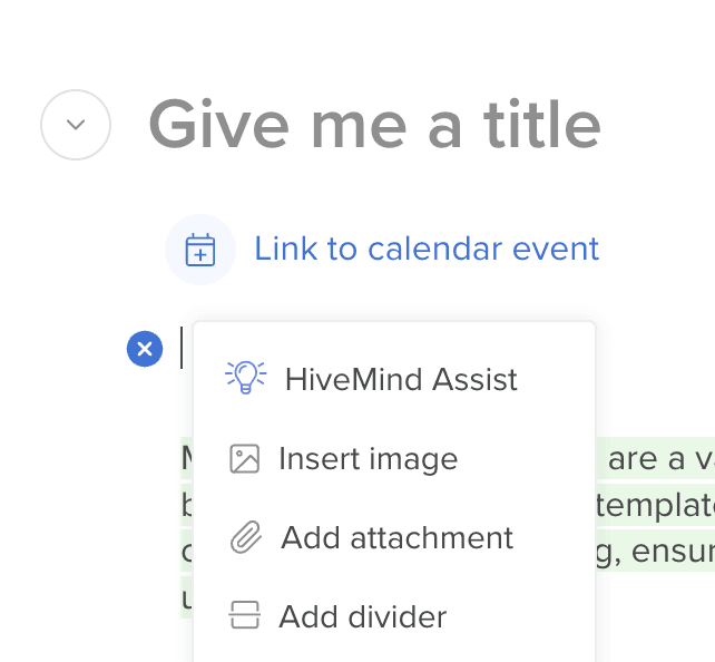 To do that, first open up Hive Apps -> Notes. From there, use the blue “+” sign and scroll to HiveMind Assist.