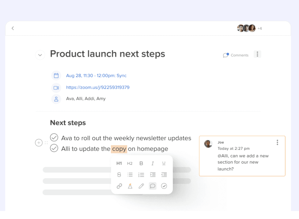 During the meeting, you can also add next steps directly to the note and turn your meeting agenda template into a living, breathing document. You can also add comments, images, and more.