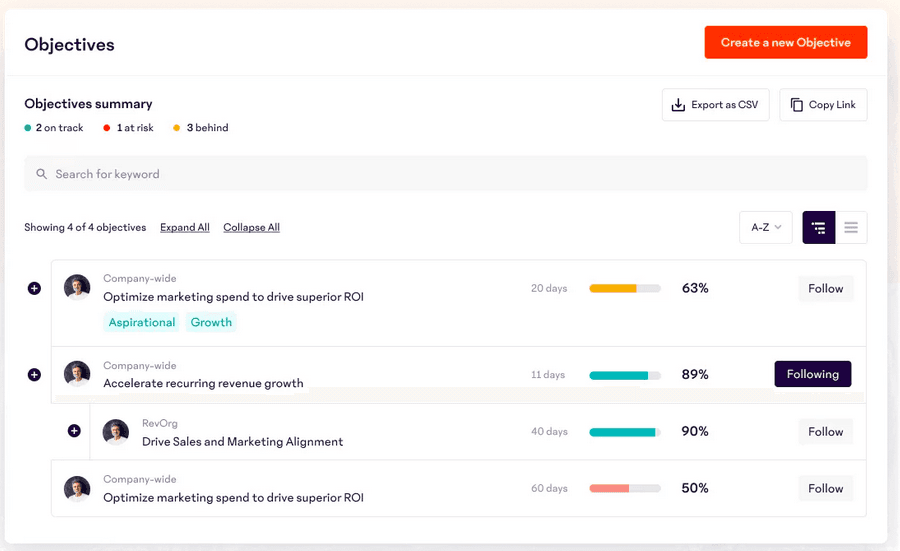 Perdoo also offers integration with popular tools such as Slack, Google Sheets, Jira, and more. There’s a free plan for up to 10 people and paid plans start at $3.50/user/month.