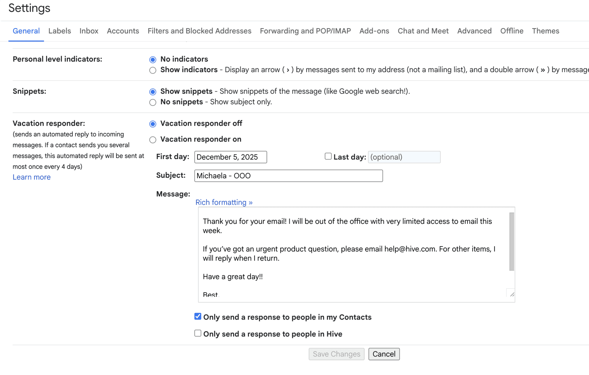 If you're a Hive user, an alternative here could be adding a Hive Form link in your out of office. If you anticipate a large volume of requests, or if you're out for more than a week, adding a Form can help consolidate requests. Once someone fills out the Hive form, it will go right into an action or project that you can tackle when you're back.