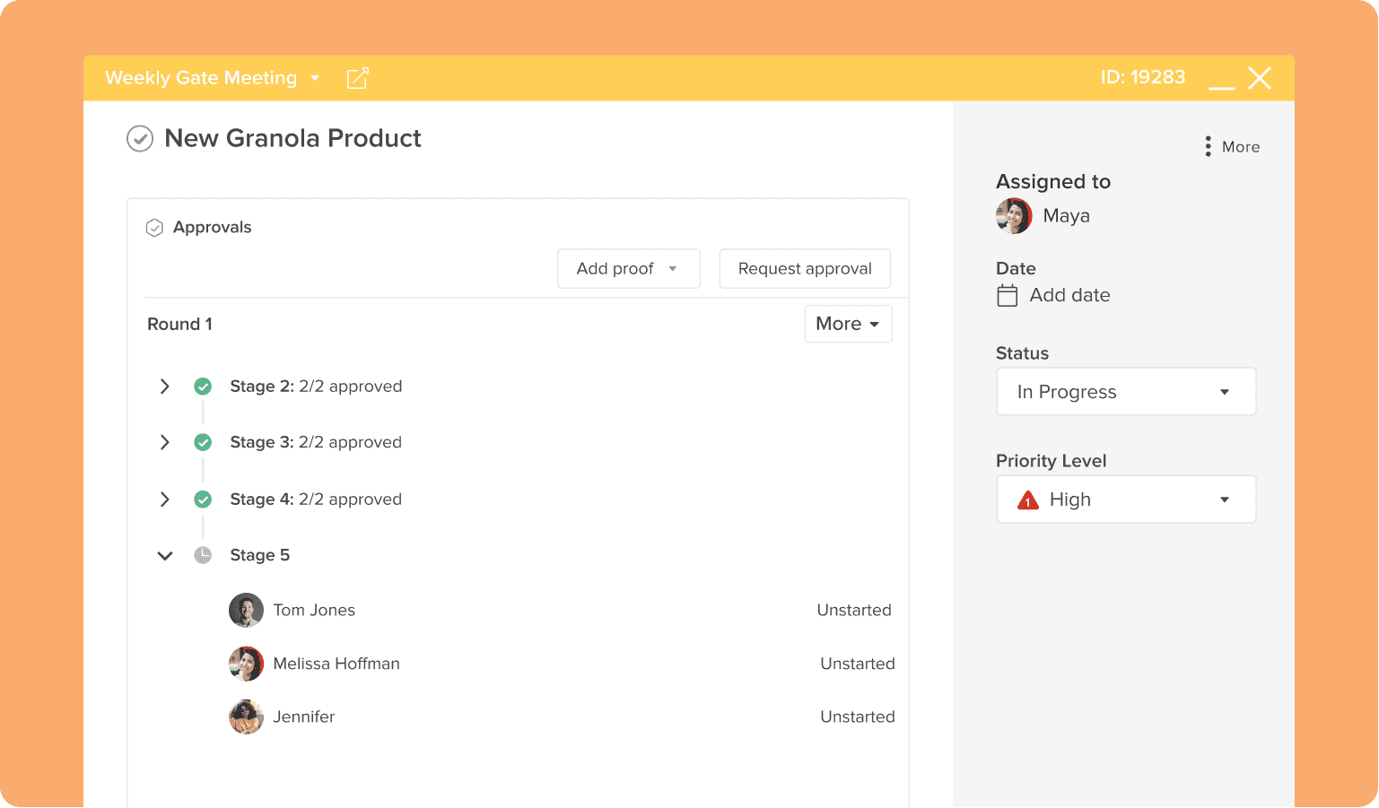When all necessary actions are completed and a project is ready to move to the next stage, the project template will prompt users to submit another form with the corresponding brief. These form submissions funnel into a project called ‘Weekly Gate Meeting,’ where Annika and any other assigned approvers will examine the project and decide if it’s ready to move forward.