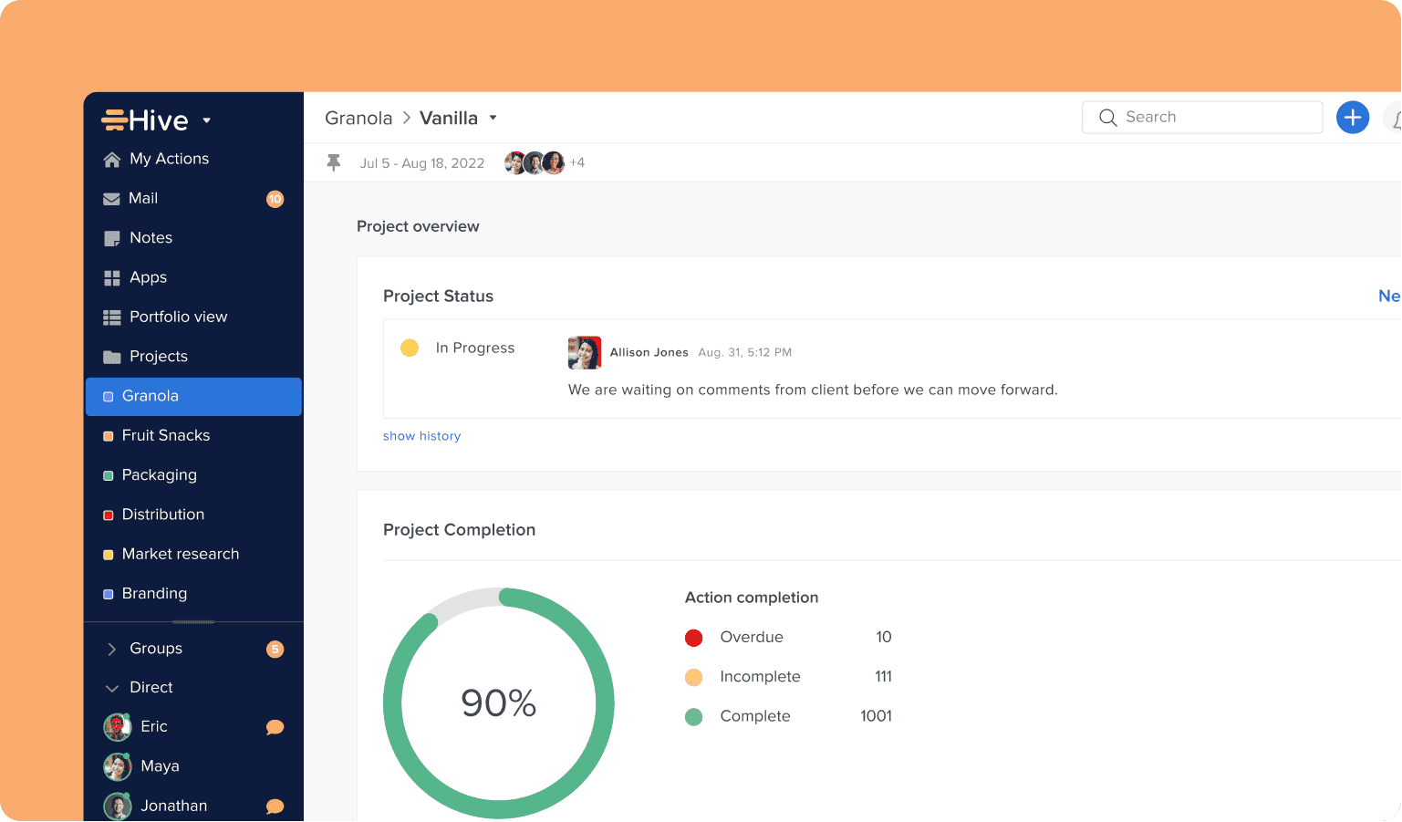 In addition to managing daily project-related tasks, Hive helps Pioneer Foods UK forecast and plan future project timelines. With Hive, Annika and her team can manage the pace at which they are moving compared to deadlines, which is helpful for keeping the team on track and managing customer expectations. Having visibility over projects at their different stages also helps the company identify pinch points in the process and attribute extra resources where required.