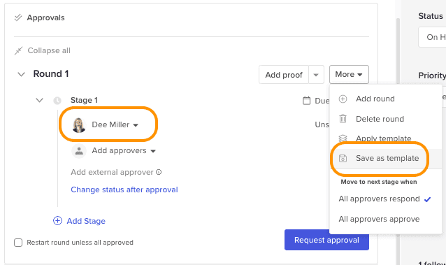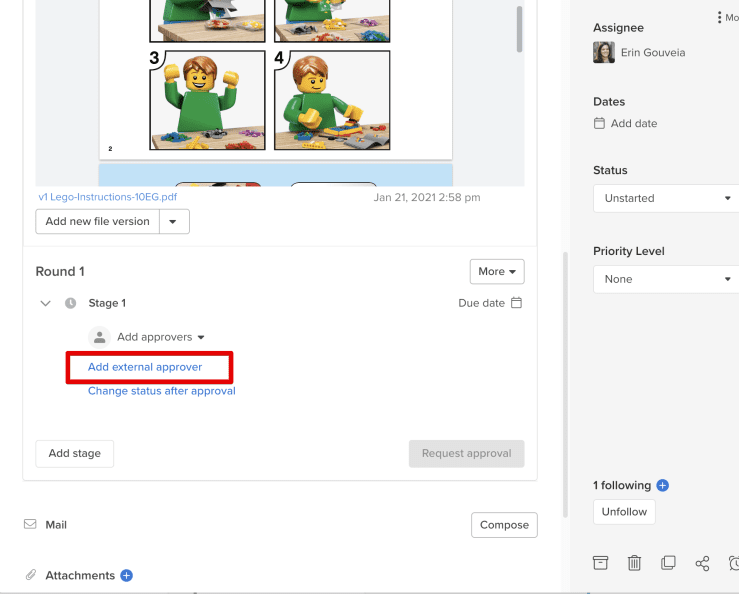 Click ‘Request approval,’ set up stages, assign titles like ‘Newsletter – First Draft,’ and specify internal contacts or teams. For external proofing, add email addresses when prompted, but note that a proof must be in the action card to include external users.