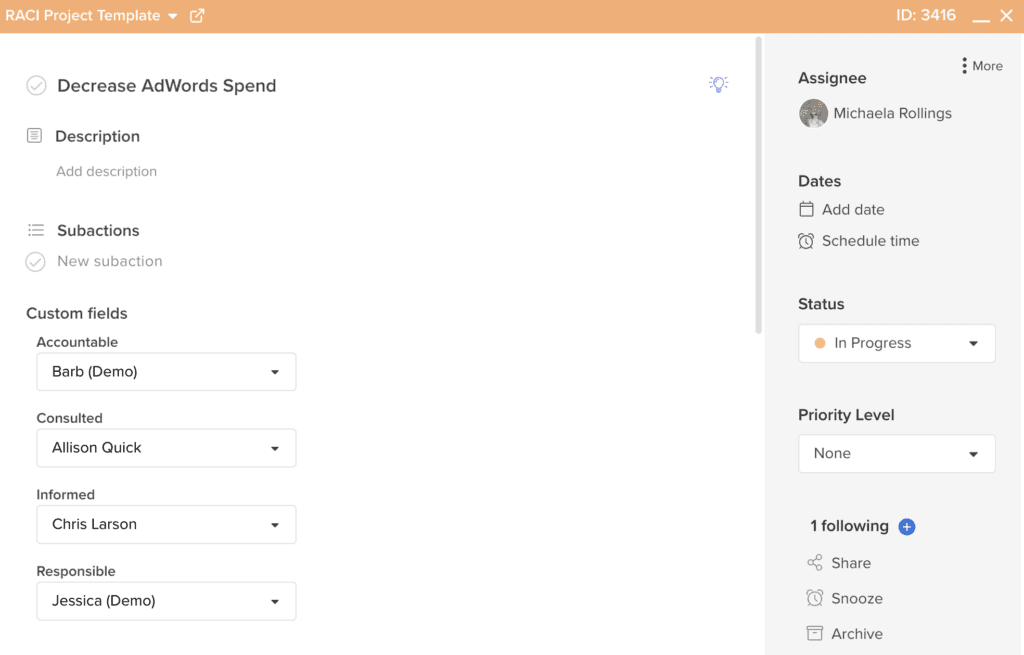 By giving the RACI template these custom fields, which apply to each RACI category, you guarantee that teammates in the field can be edited or swapped easily. Click here to learn a bit more about custom fields and how you can leverage them in your project.