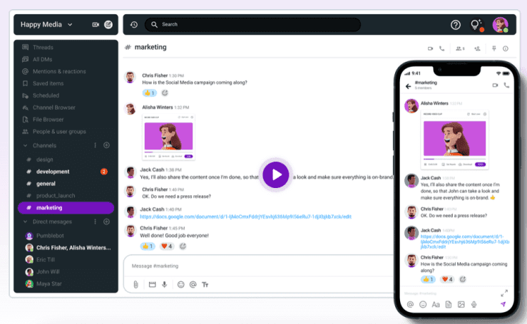 Pricing: Free with unlimited users and message history. Pro plan costs $2.49 per user/month billed annually and has all features from free plan, plus group meeting (voice and video), screen sharing, customizable sections and 10GB storage per seat. Pumble’s business plan starts at $3.99 per user/month billed annually and includes permissions, guest access, usr groups and up to 20GB storage per seat. If you need more privacy and safety, their enterprise plan offers single sign-on (SSO) with data retention and 100GB storage per seat for $6.99 per user/month billed annually.