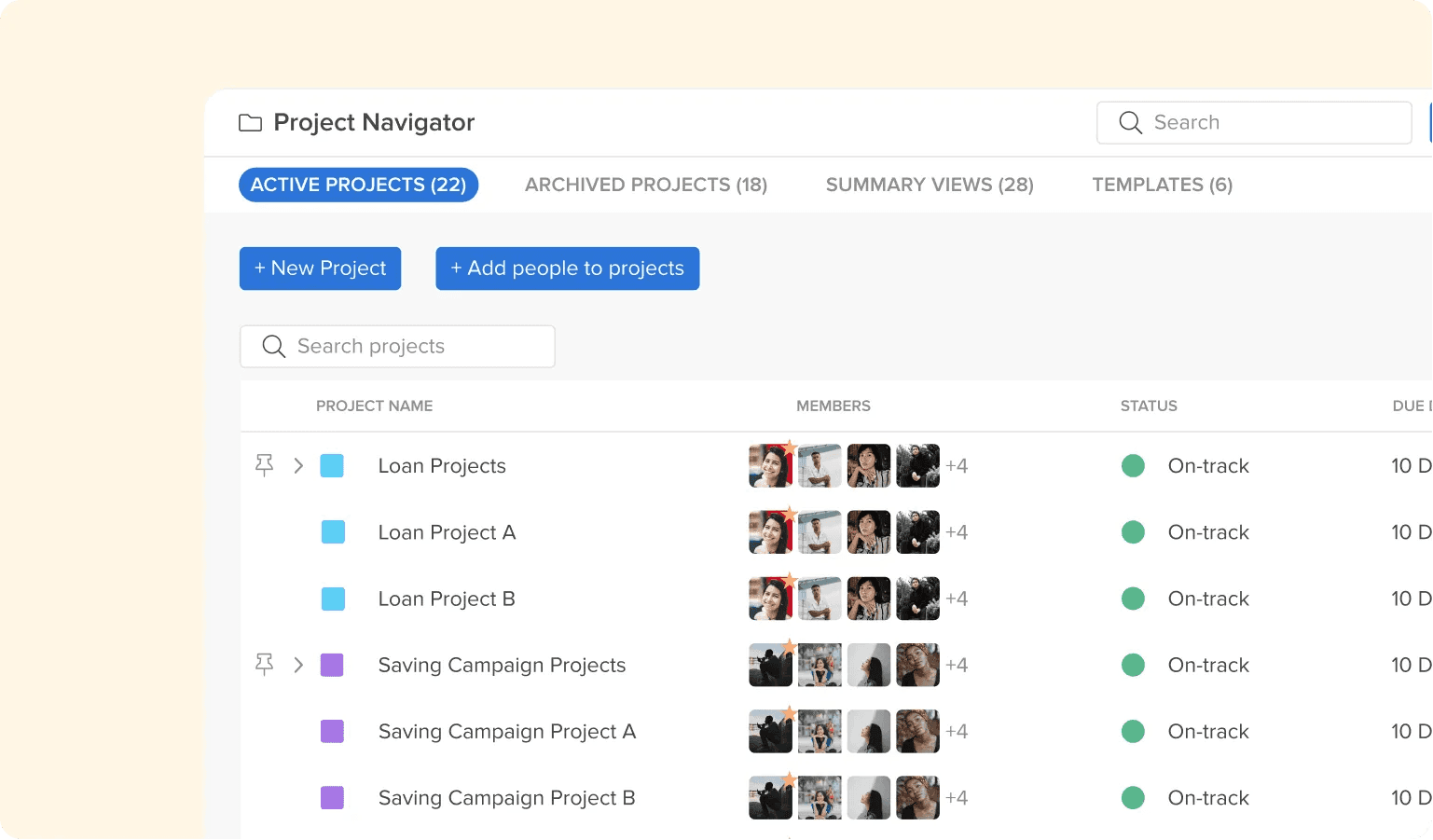 Within Hive, the team has set up color-coded folders for each type of financial product at the Credit Union. For example, all of the loan projects are colored bright blue, and they sit under a bright blue “Loan” parent project folder. On the other hand, all savings campaign projects are purple. This helps the team stay organized and keep all projects in the correct place.
