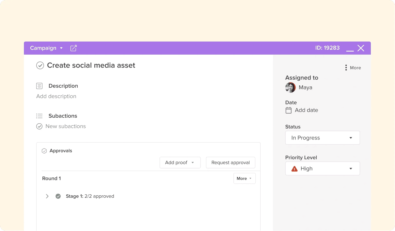 Work for each deliverable is broken down into subactions, which are assigned to different members of the team. “On the action cards, we add subactions for tasks and assign them to the right people, so everything can happen in order. So, for example, our graphic designer creates an asset, which then goes to another team member to be reviewed. The asset keeps moving from one person to the next, until it's finished and sent for final approval.”