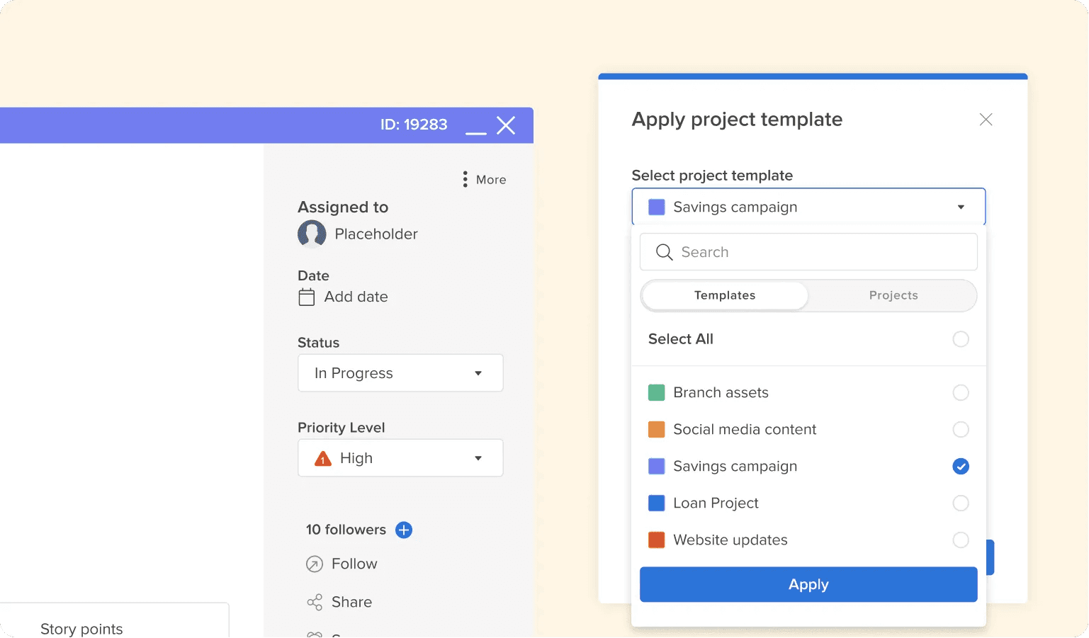 To apply a template from an active project, Courtney goes to the menu within the project, selects 'Apply project template' and chooses a template from the team’s active projects. Once the actions have populated automatically, Courtney can customize the new project by adding or removing details.