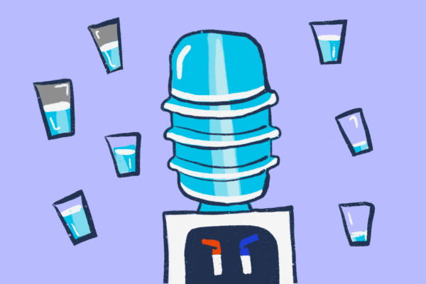 A virtual water cooler can take place in a messaging app or on a Zoom call. It serves the same purpose as an in-person water cooler: facilitating social interactions between coworkers who may work in different teams (and now in different locations).
