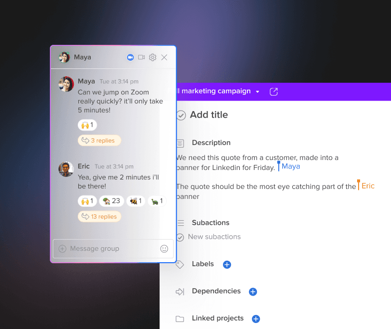 Individual tasks can be assigned to anyone who is responsible for them, and Hive Chat allows team members to stay connected and aligned throughout the project lifecycle. A few more features that make Hive a great work management tool:
