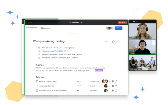 “I cannot imagine running a meeting without an agenda. There’s nothing more frustrating than showing up to a meeting — especially a virtual one — where there is no plan. That’s why I created Hive Notes for Zoom, an app that lets you share an agenda, take collaborative notes, and then assign tasks to anyone in the meeting. Finally, an agenda that helps you power your meetings from beginning to end.” — John Furneaux, CEO at Hive