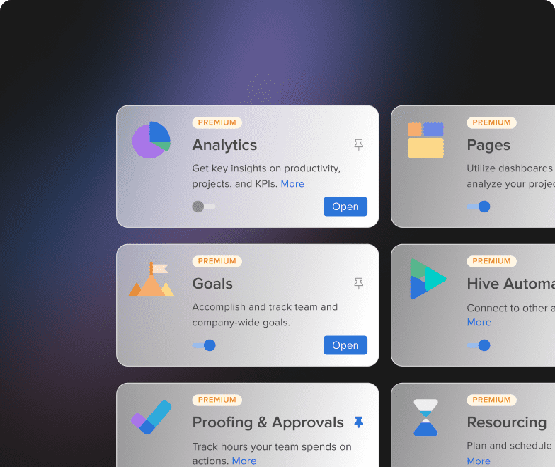 Porque tus herramientas deben trabajar para ti, no al revés. Personaliza tu espacio de trabajo con complementos productivos (y divertidos). Accede a un conjunto completo de complementos, integraciones y mucho más con Hive Apps.