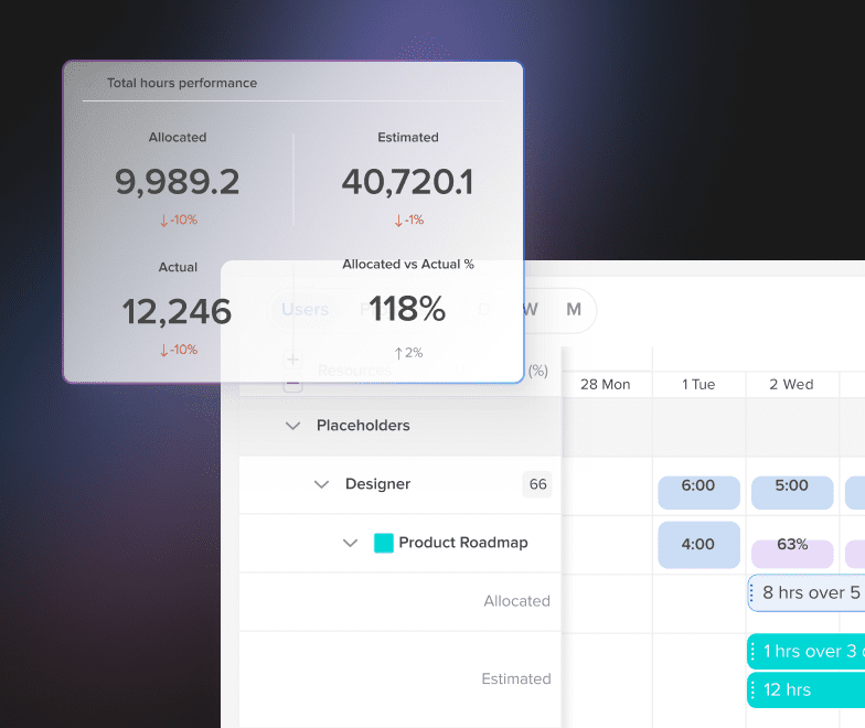 Planifica la asignación de los miembros del equipo y las responsabilidades del proyecto por semana. Asigna recursos de equipo (ya sean individuales o marcadores de posición) por proyecto para ayudar a tu equipo y a tu organización a mantener el rumbo. Edita, modifica o reasigna compañeros de equipo fácilmente con un clic.