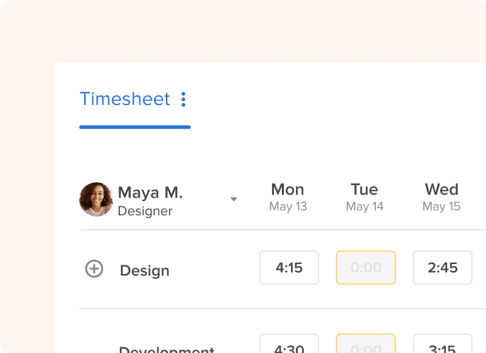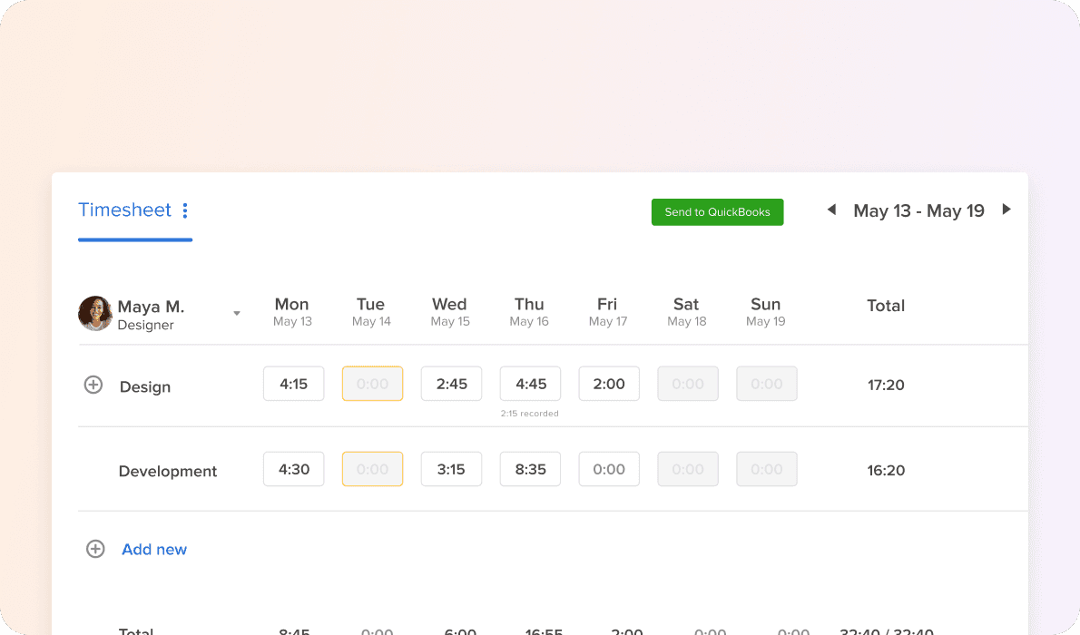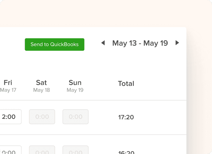 Track time by project, client, and team member, then roll it up into clean timesheets for billing. When it’s ready, send it to QuickBooks and invoice with confidence.