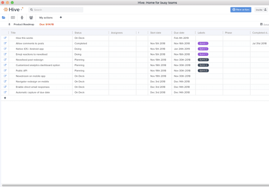 With so many possible spreadsheet uses to optimize your business, it’s important to have a powerful tool to manage these projects. At Hive, we love organizing our work in Table View, a spreadsheet layout where your actions are organized in a list of rows. Simply click to edit any field, and you can filter by multiple fields (i.e. label, assignee, and even custom fields) to hone in on specific actions. It’s great for projects where you have a lot of data that you want to be able to rearrange quickly.